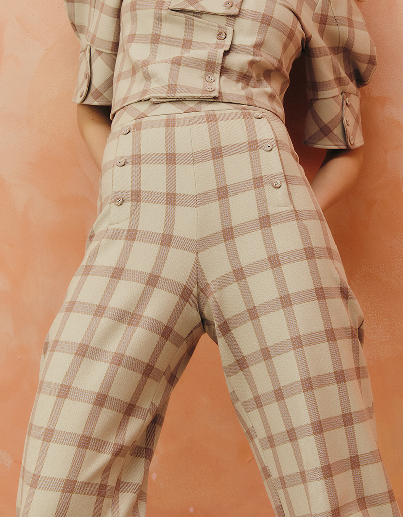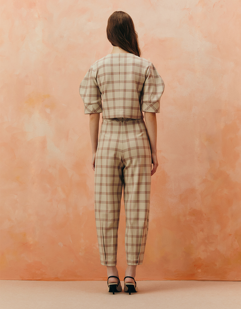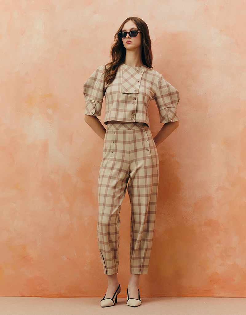 Detail : กางเกงเอวสูง ทรงเทเปอร์ ขาเรียวปลายสอบ ให้ลุคเฟมินีนและปราดเปรียว ลายตารางโทนชมพูนู้ด แมตช์ได้ทั้งลุควินเทจและโมเดิร์น สามารถสวมเข้าชุดกับแจ็คเก็ตผ้าลายเดียวกัน หรือจับคู่กับไอเทมเรียบเพื่อขับลายผ้าให้โดดเด่น