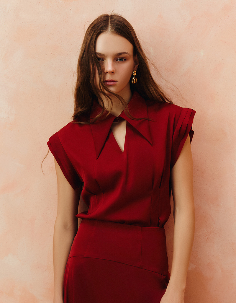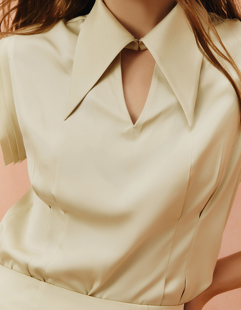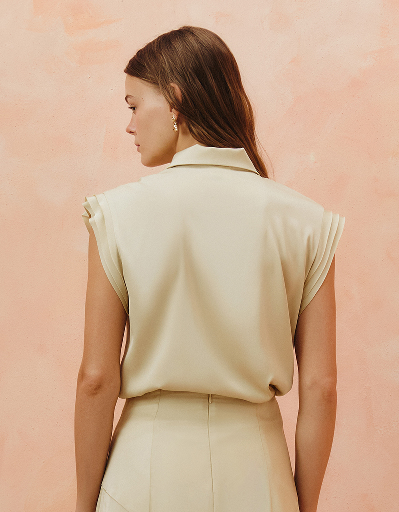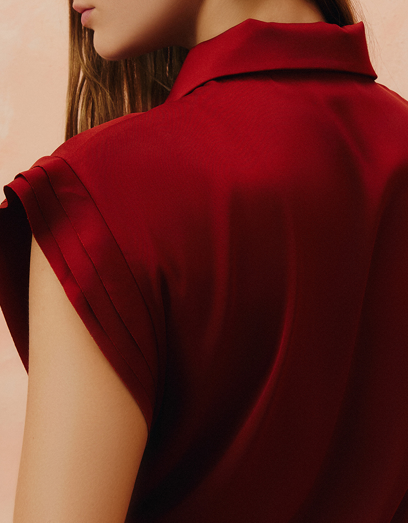 Detail : โดดเด่นด้วยปกคอดีไซน์เฉพาะตัวแบบ V-neck ที่ให้ลุคทันสมัย ไหล่เสื้อมีการเสริมโครงสร้าง พร้อมดีเทลการตกแต่งด้วย “3-Layer Bias Trimming” (การเดินผ้าเฉลียงซ้อน 3 ชั้น) บริเวณไหล่ ซึ่งสร้างมิติและวอลลุ่ม ให้ความรู้สึกถึงงานสถาปัตยกรรม