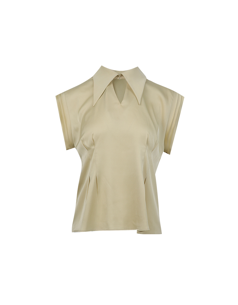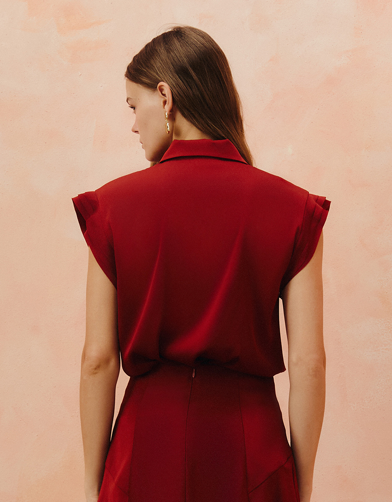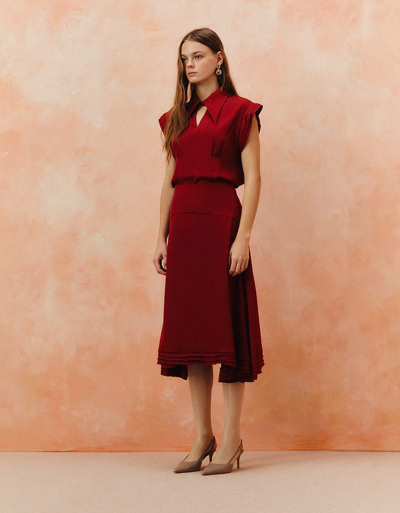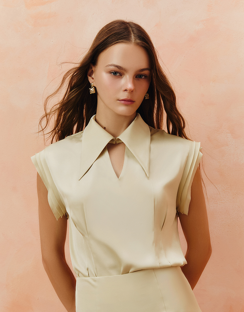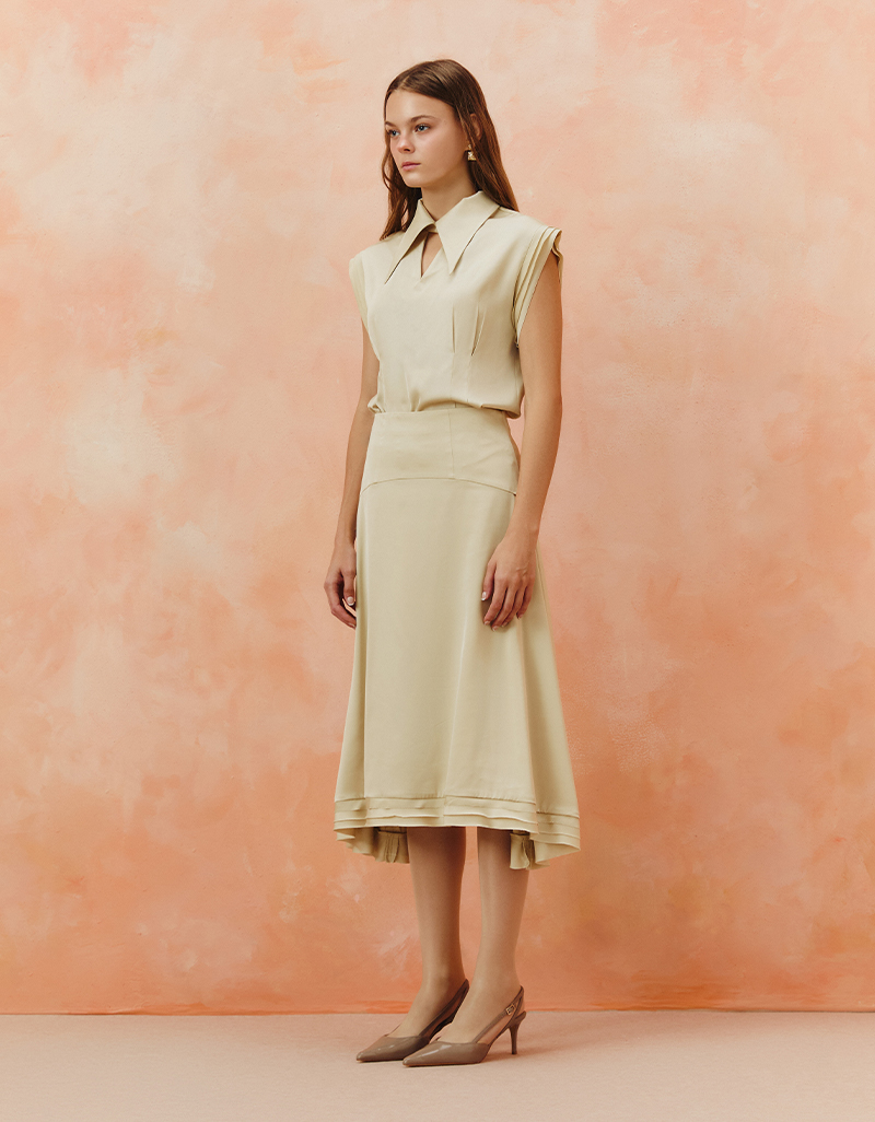 Detail : โดดเด่นด้วยปกคอดีไซน์เฉพาะตัวแบบ V-neck ที่ให้ลุคทันสมัย ไหล่เสื้อมีการเสริมโครงสร้าง พร้อมดีเทลการตกแต่งด้วย “3-Layer Bias Trimming” (การเดินผ้าเฉลียงซ้อน 3 ชั้น) บริเวณไหล่ ซึ่งสร้างมิติและวอลลุ่ม ให้ความรู้สึกถึงงานสถาปัตยกรรม