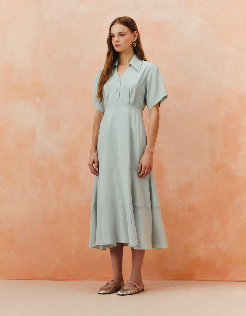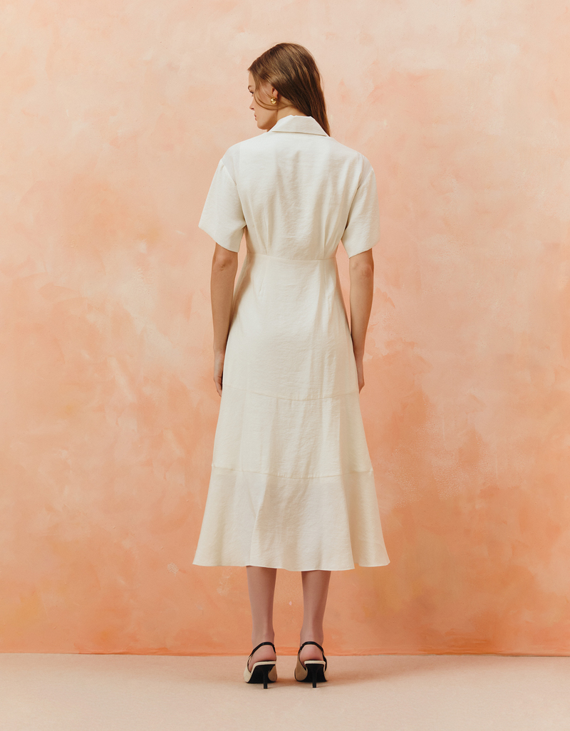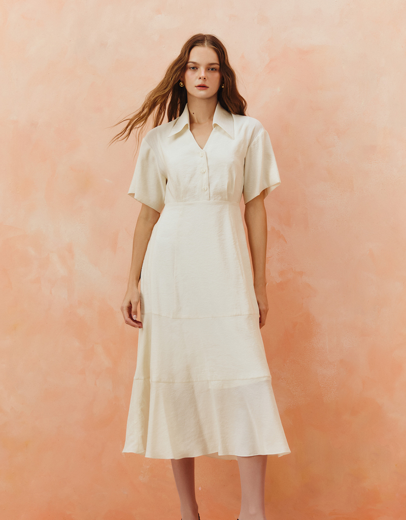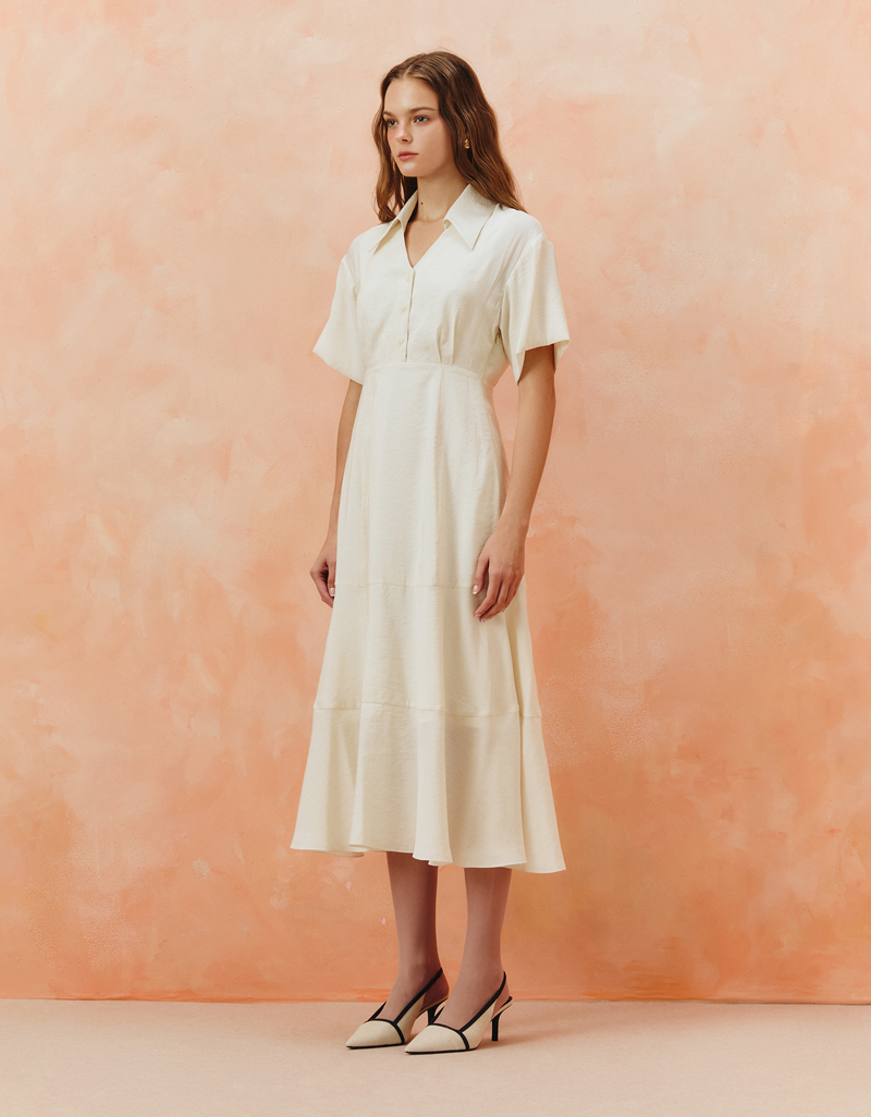 Silhouette : Midi-length A-line dress with a soft shirt collar, short sleeves, gentle waist shaping, and subtly flared hem for a clean, feminine look.