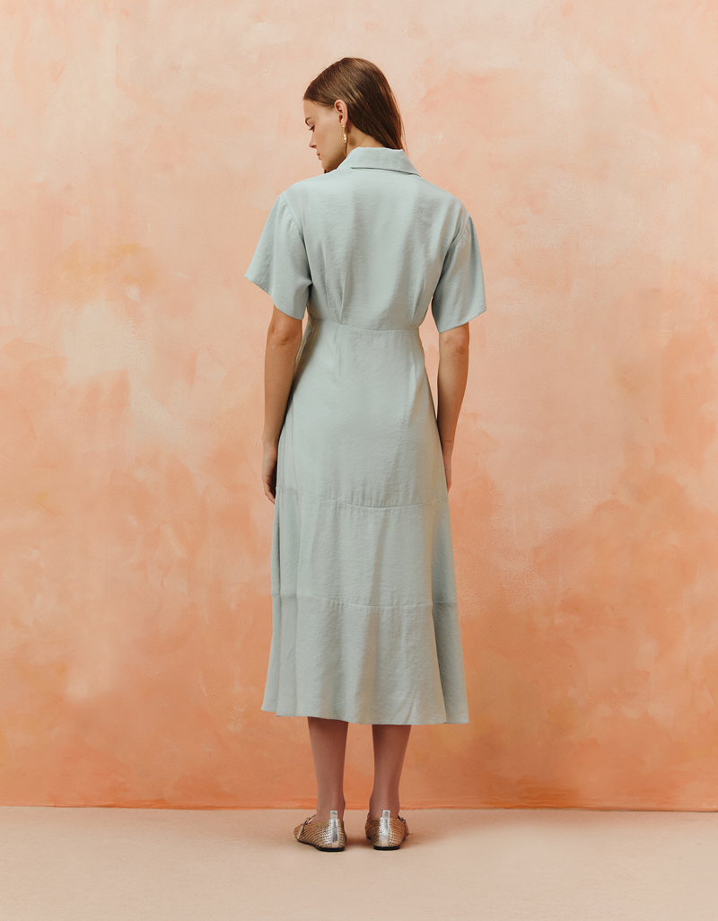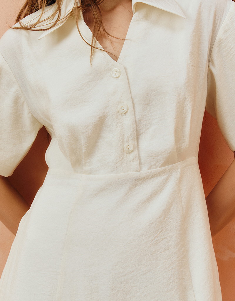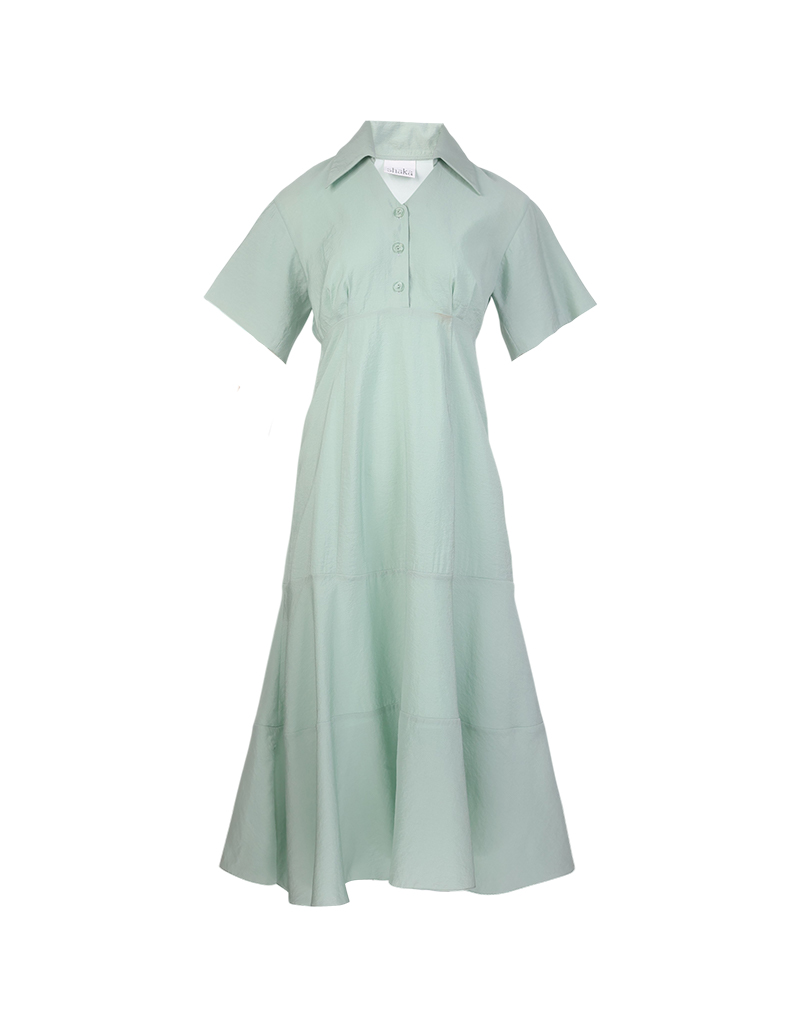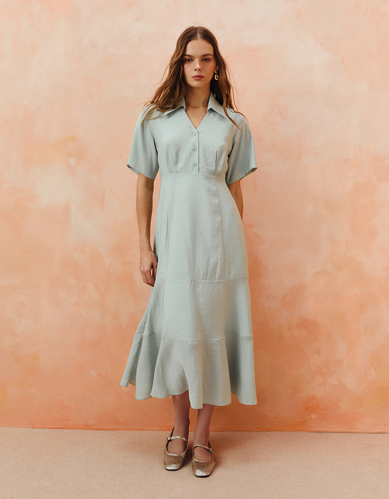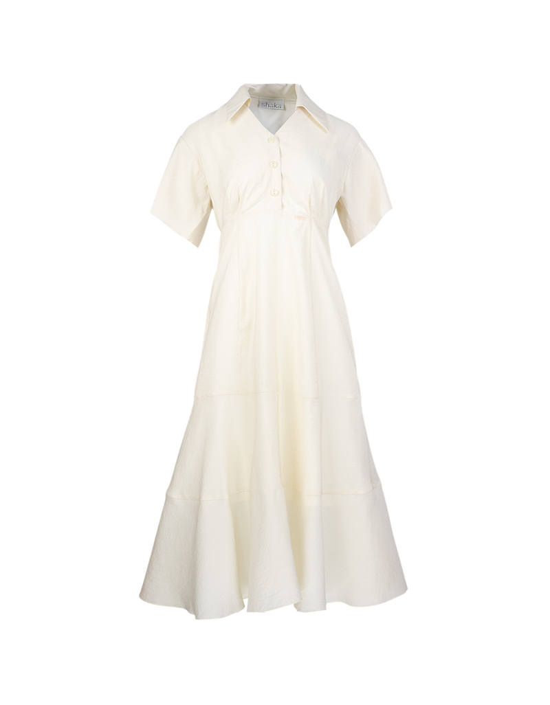 Silhouette : Midi-length A-line dress with a soft shirt collar, short sleeves, gentle waist shaping, and subtly flared hem for a clean, feminine look.