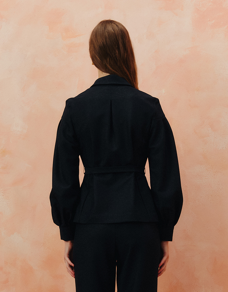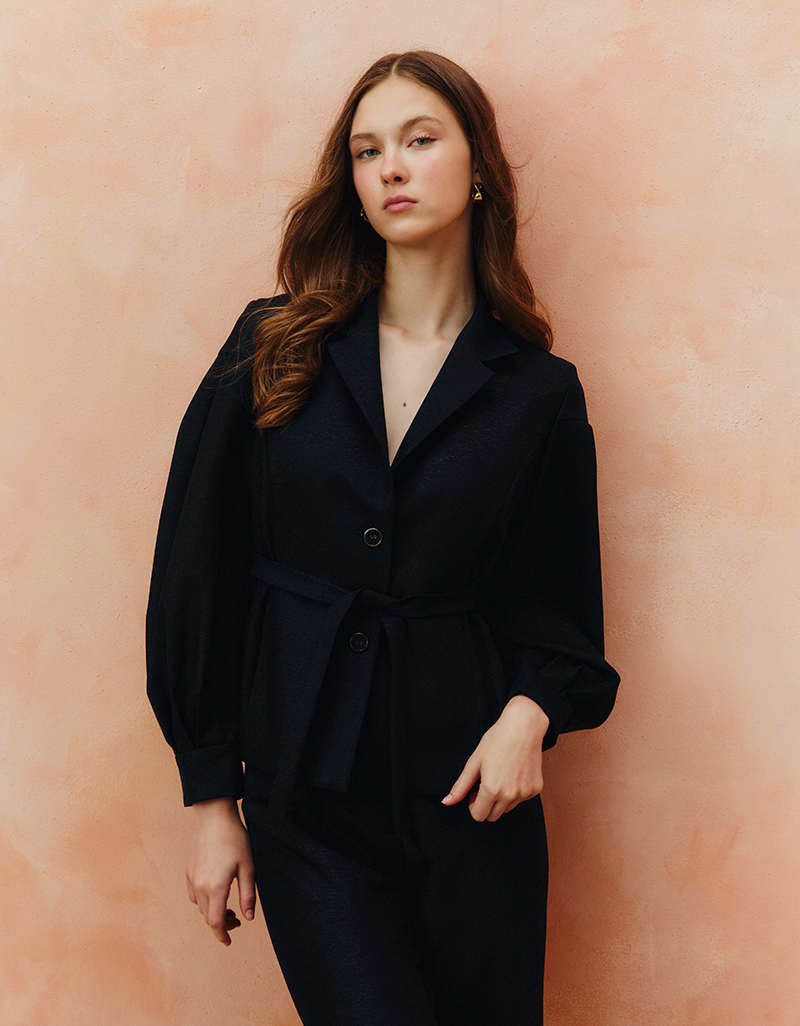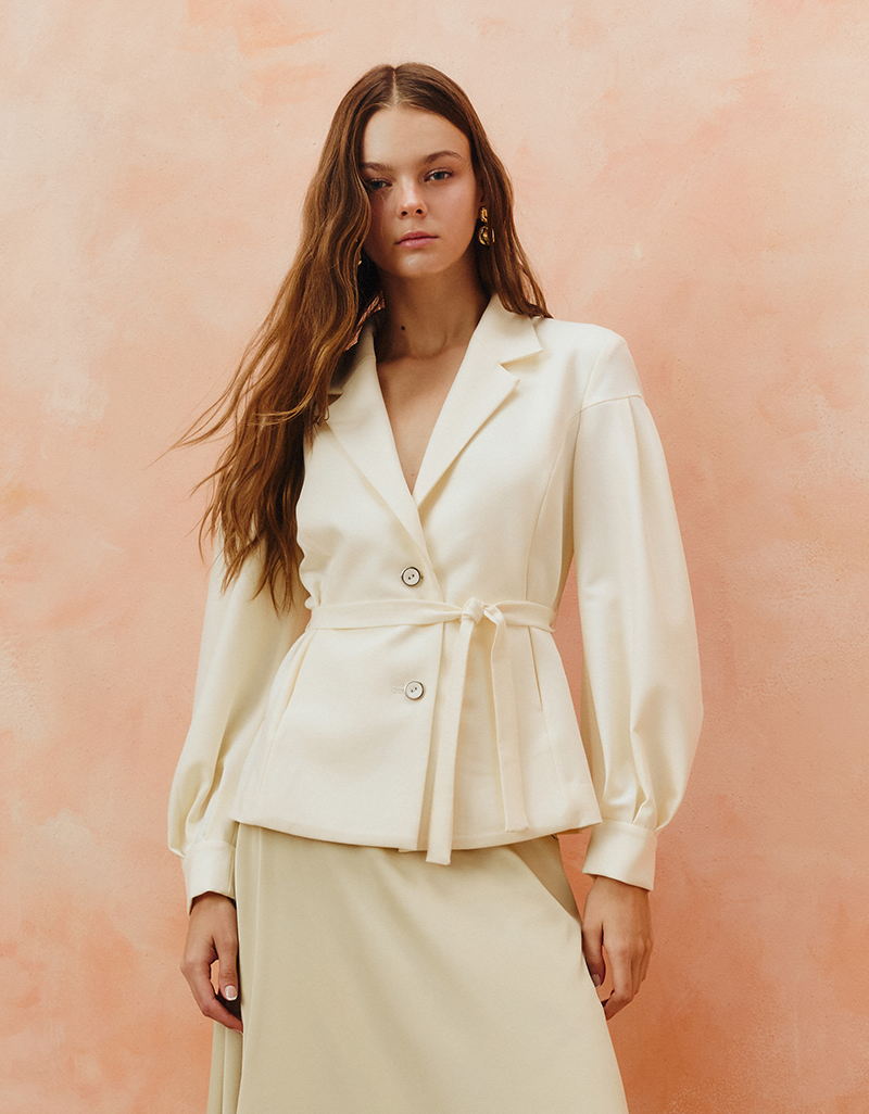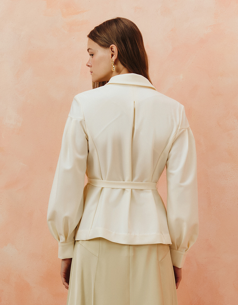 Silhouette : Fitted tailored jacket with a soft lapel collar, puffed long sleeves, and adjustable waist belt for a structured yet feminine shape.