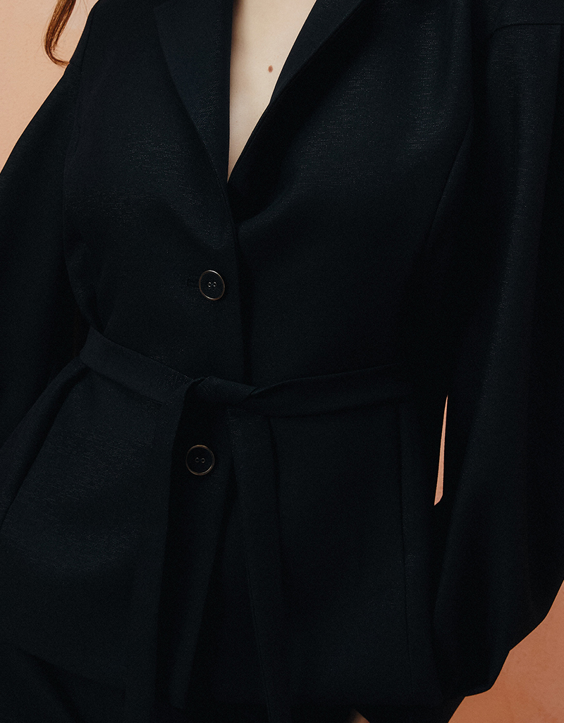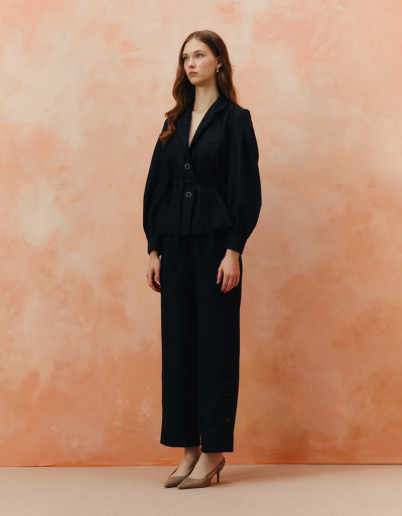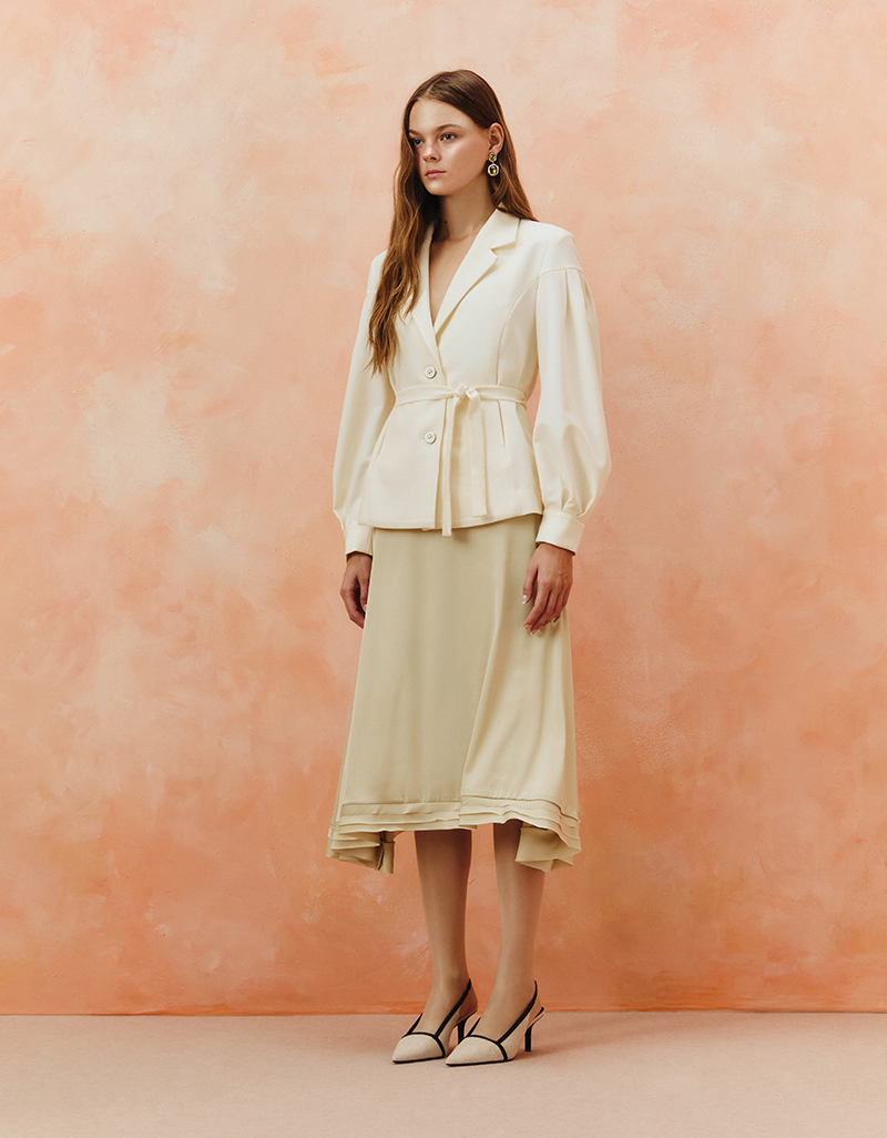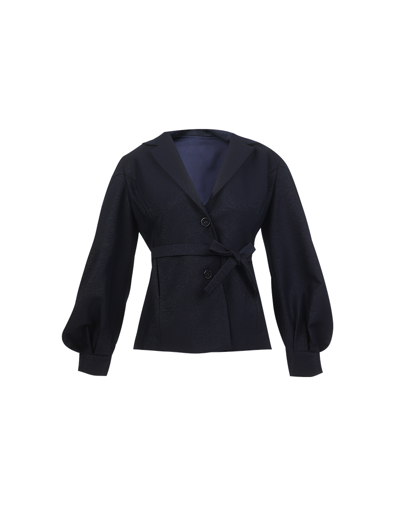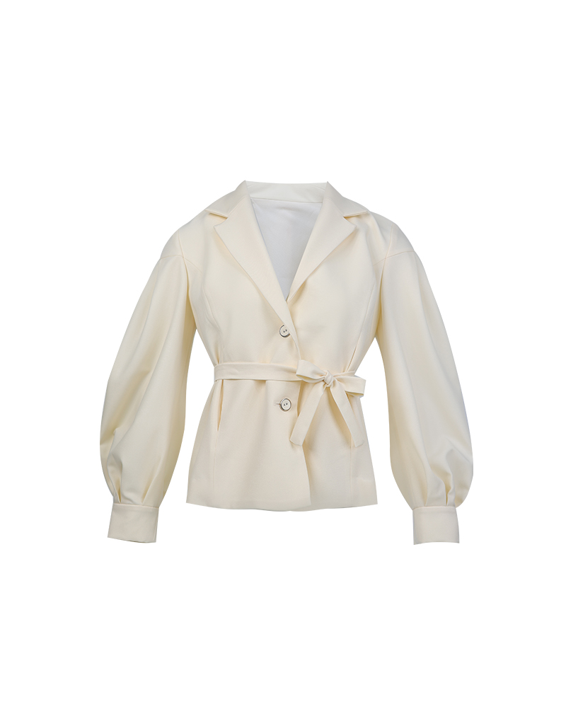 Silhouette : Fitted tailored jacket with a soft lapel collar, puffed long sleeves, and adjustable waist belt for a structured yet feminine shape.