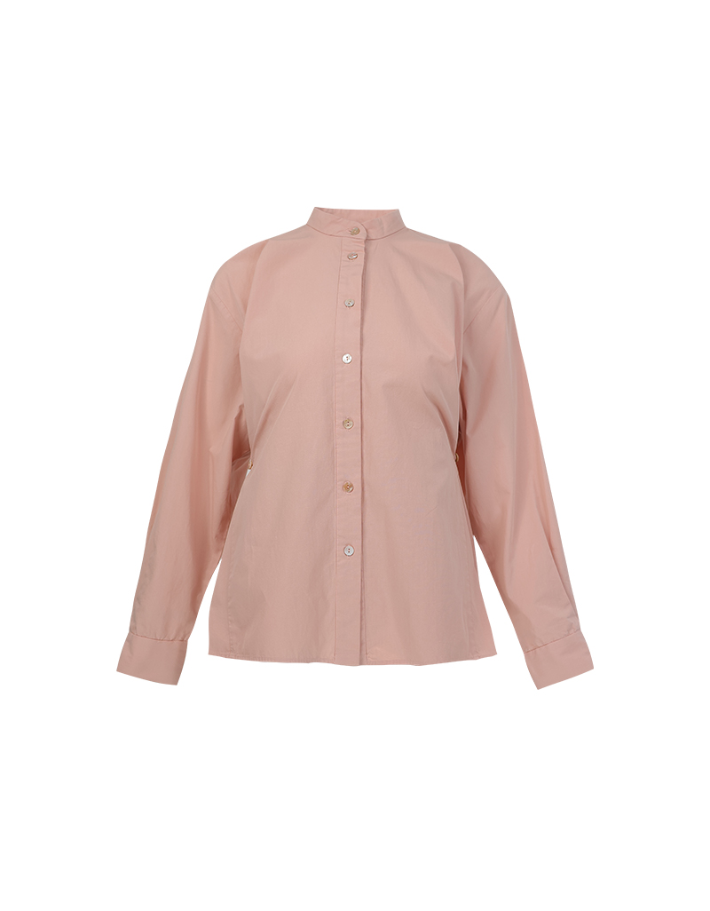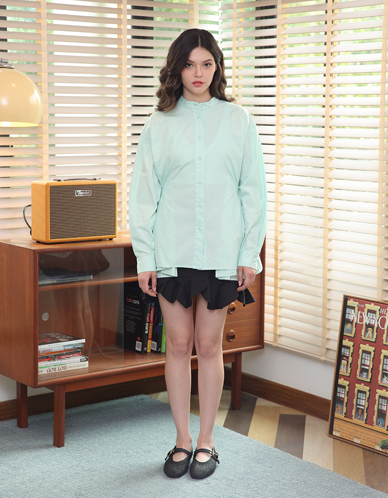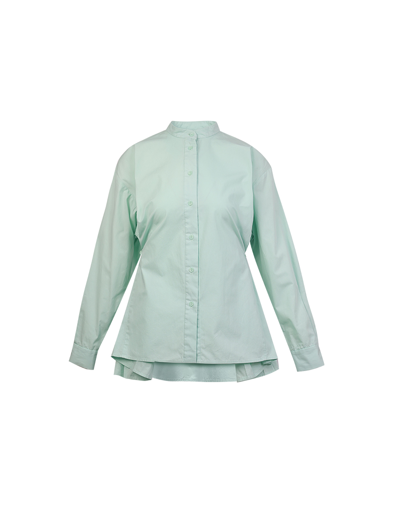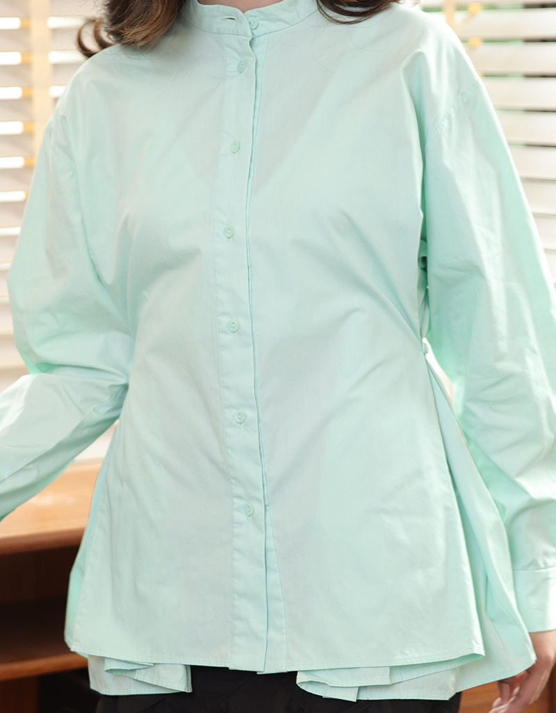 Silhouette : Relaxed long shirt with stand collar, front button placket and adjustable pleated side panels