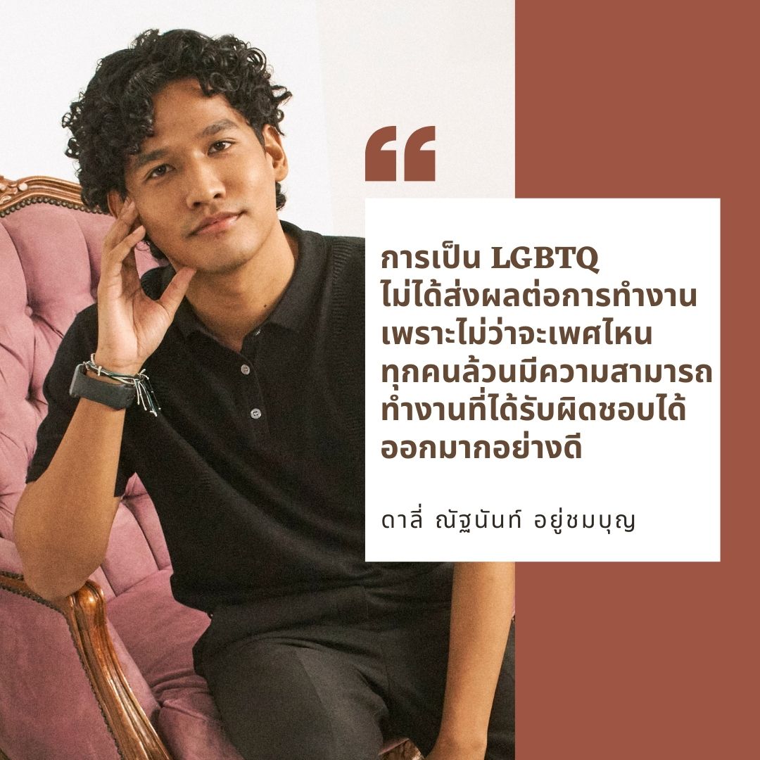 และเมื่อถามว่า ความเป็น LGBTQ+ ส่งผลดีต่อการทำงานด้านแฟชั่นหรือไม่ คุณดาลี่มีความเห็นต่างออกไปว่า “การเป็น LGBTQ ไม่ได้ส่งผลต่อการทำงาน แต่มองว่าไม่ว่าจะเพศไหน หรือรสนิยมทางเพศเป็นอย่างไรทุกคนล้วนมีความชอบและมีความสามารถ ที่จะทำงานที่ได้รับผิดชอบได้ออกมากอย่างดี หากมองว่าเรื่องเพศที่สาม หรือเพศทางเลือก สามารถทำงานด้านแฟชั่นได้ดี นั้นคงไม่ถูกต้อง เพราะ ครูบาอาจารย์ที่มอบความรู้ และสั่งสอน มีทั้ง เพศหญิง เพศชาย หรือเพศทางเลือก ที่มีความสามารถด้านนี้ และสามารถสั่งสอน สรรค์สร้างบุคคลากรที่มีความสามารถให้กับอุตสาหกรรมแฟชั่น และสังคมได้”