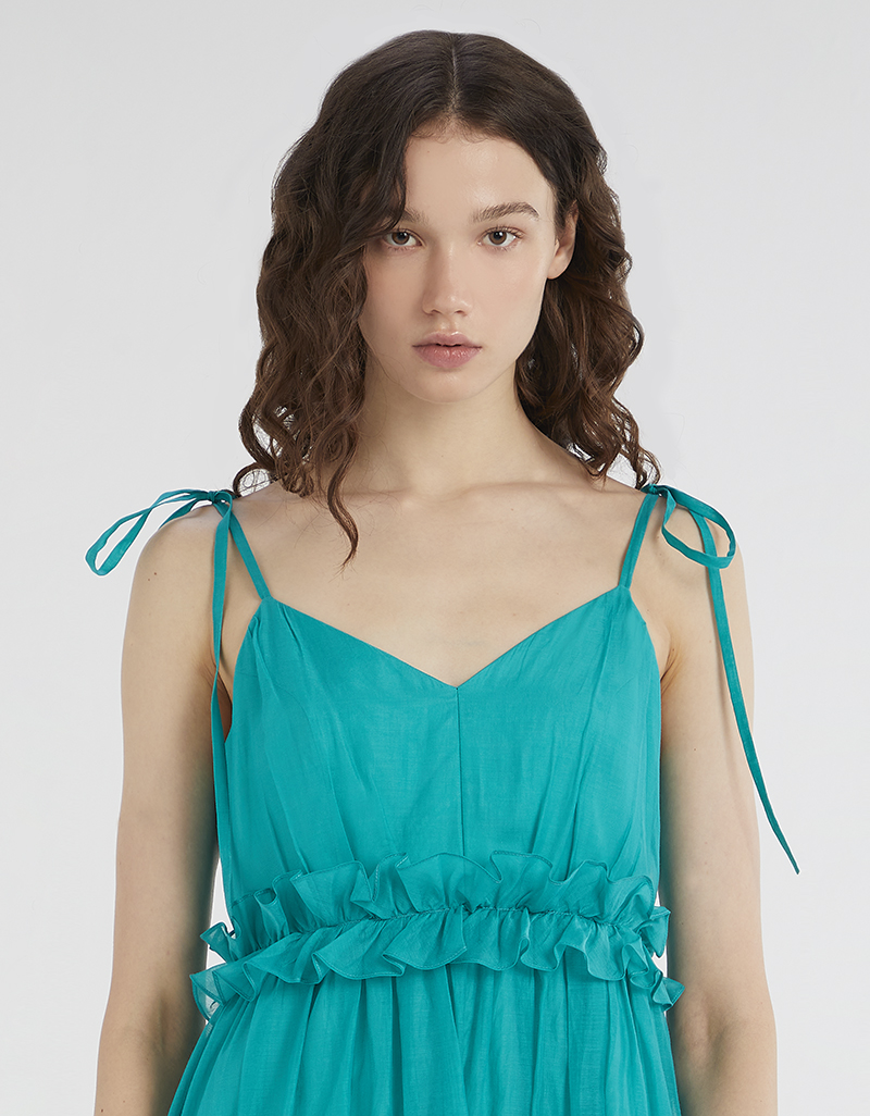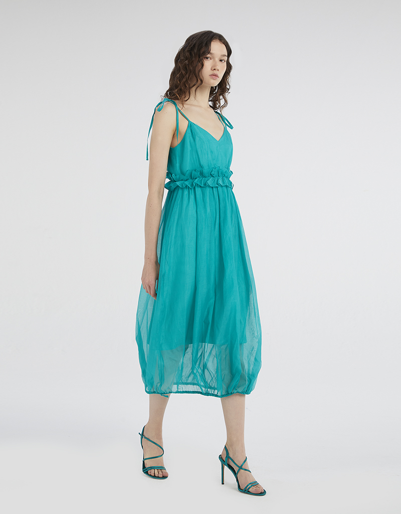 Detail : สายเดรสผูกโบว์ มีดีเทลแต่งจับจีบรูดช่วงเอว ชายเดรสสอดไส้ไก่ รูดเพื่อให้ชายเดรสเป็นทรง Balloon ความยาวคลุมเข่า