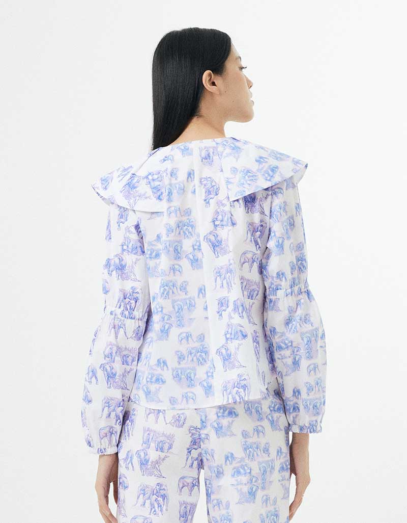 Detail : เสื้อลาย “จ้างเวียง” ปกจีบแต่งเย็บกลับเป็น curve แขนพองสอดยางยืด