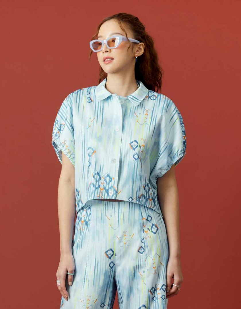 Detail : เสื้อทรงบอลลูนรูดปลายแขน ปกเชิ้ต ชายเสื้อหน้าสั้นหลังยาว กระดุมหน้า พิมพ์ลายอิแคต บนผ้าคอตตอนซาติน