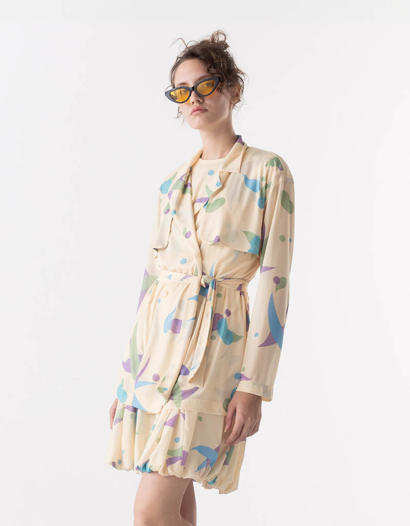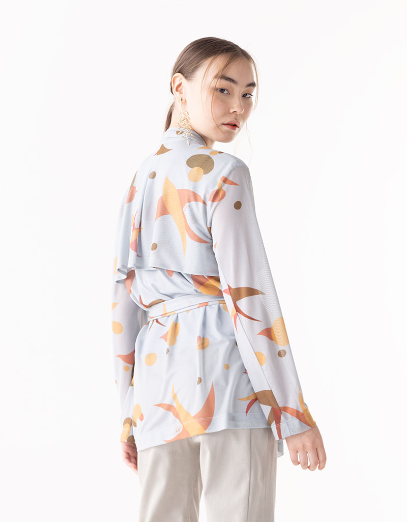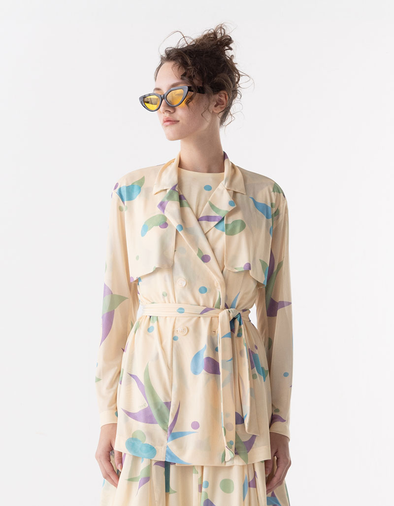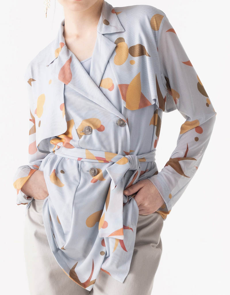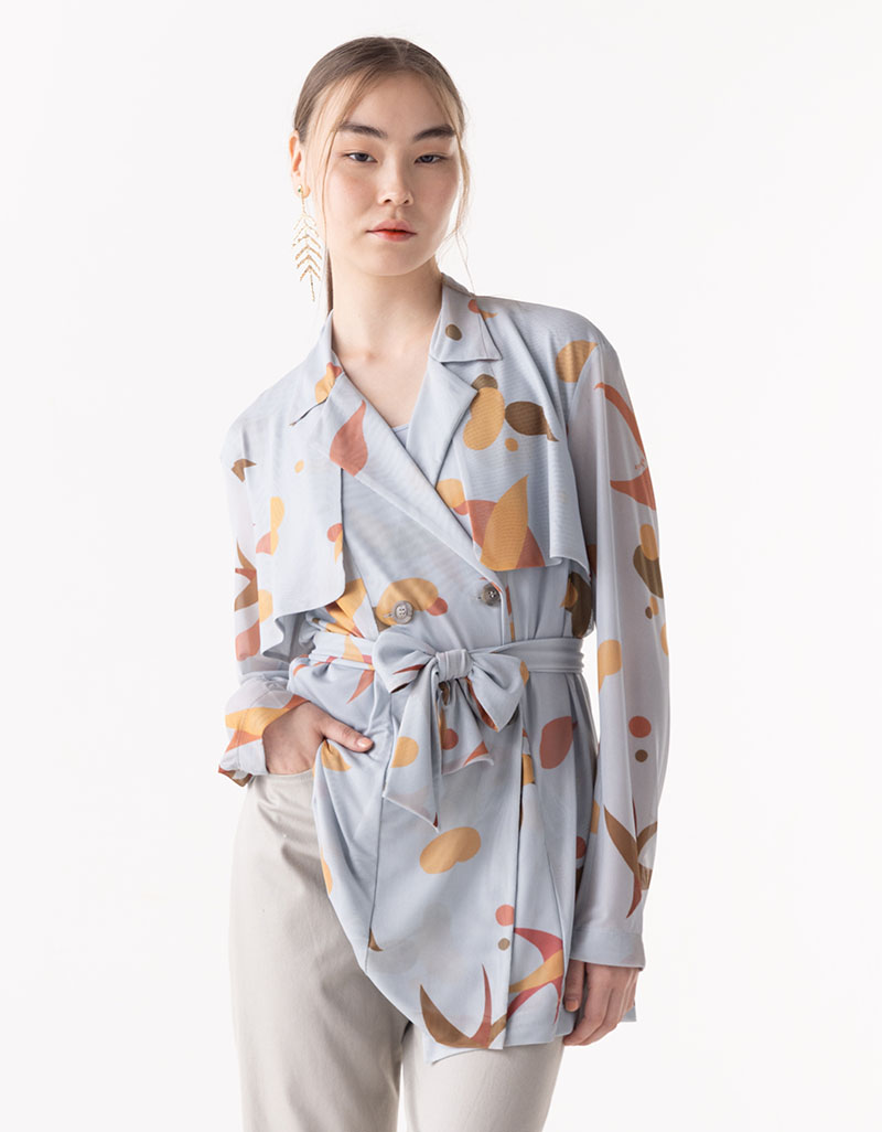 Detail : แจ็คเก็ตผ้าตาข่ายยืด พิมพ์ลาย Original Print Shaka ดีไซน์แบบ Trench Jacket ให้ลุคที่ทันสมัย สบาย ตัวเสื้อมี Inner เป็น Tank Top ผ้า crepe สีเข้ากับตัวเสื้อ สวมใส่ง่าย