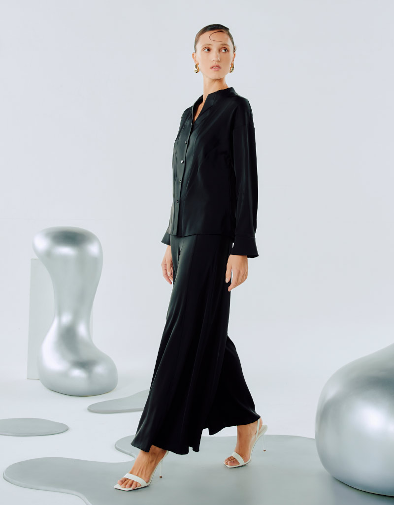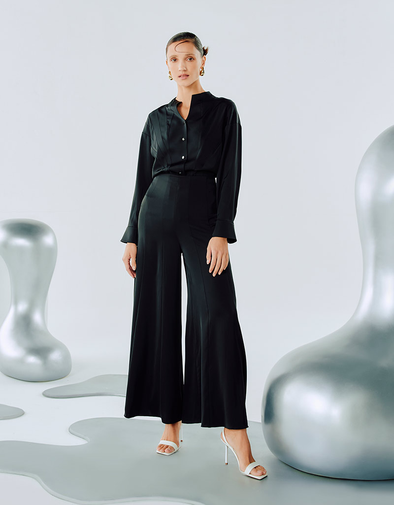 Detail : กางเกงทำจากผ้าซาตินสีดำ เงา มีน้ำหนักทิ้งตัว ด้วยดีไซน์ที่ตัดต่อเป็นลาย ray ปลายขาบาน และพริ้ว ทำให้ดู elegant