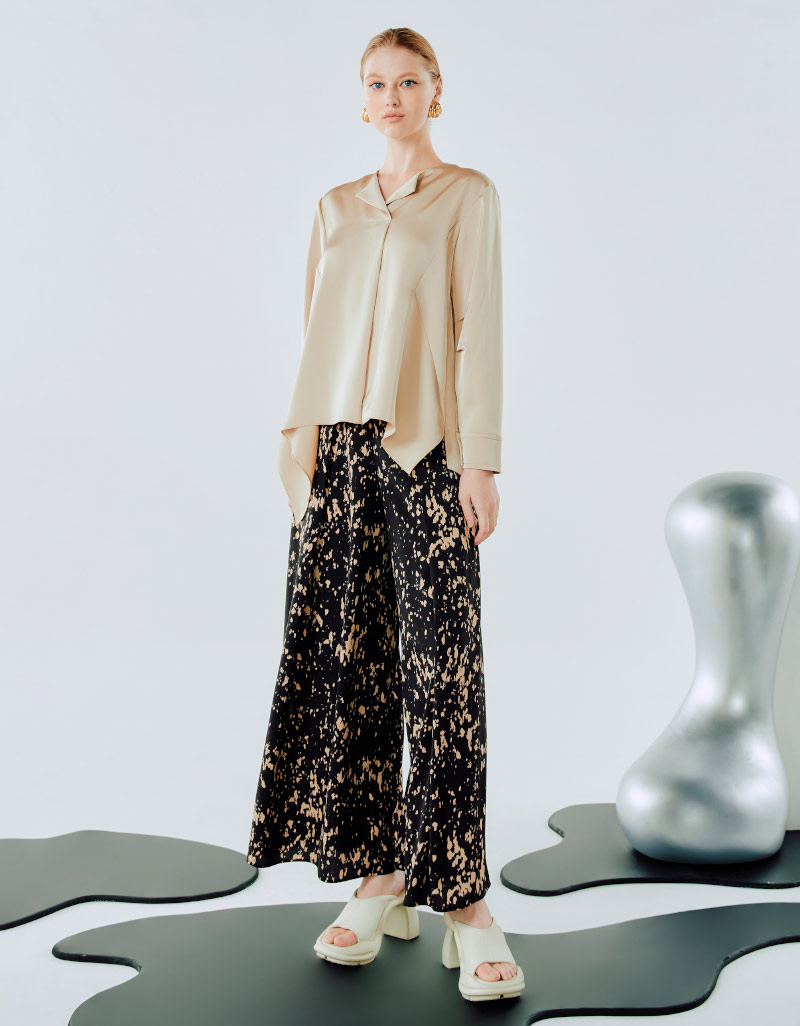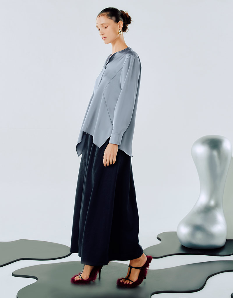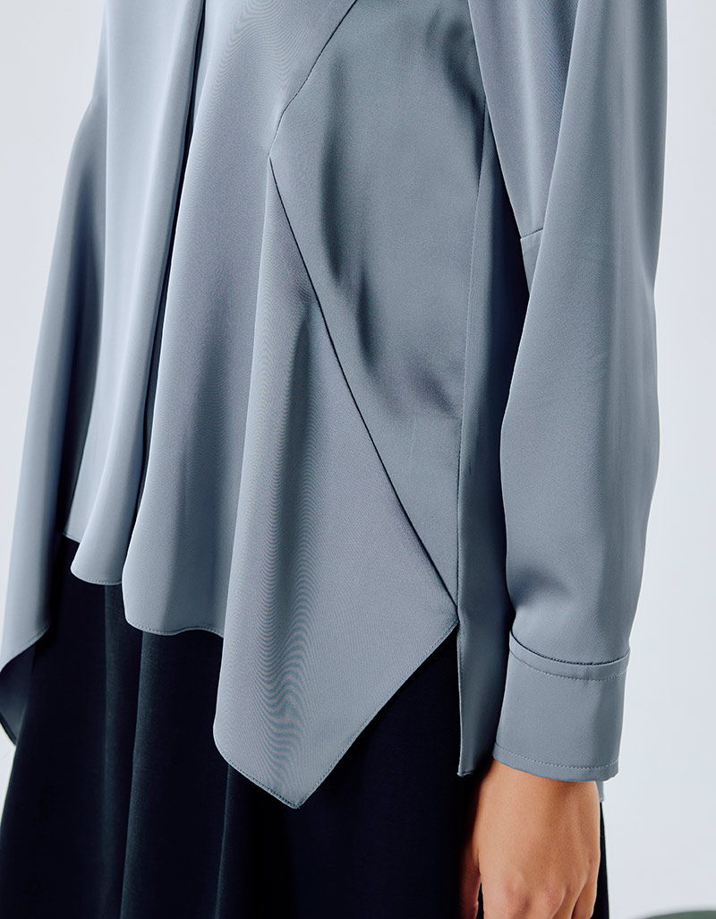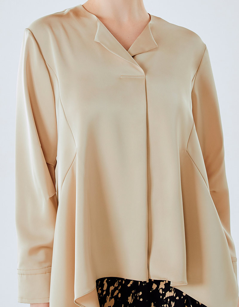 Detail : Blouse ผ้าซาติน แขนยาว ต่อขอบแขน โครงเสื้อ relax fit คอหน้าเจาะสาบติดกระดุม โดดเด่นที่ชายเสื้อ flare เล่นระดับ
