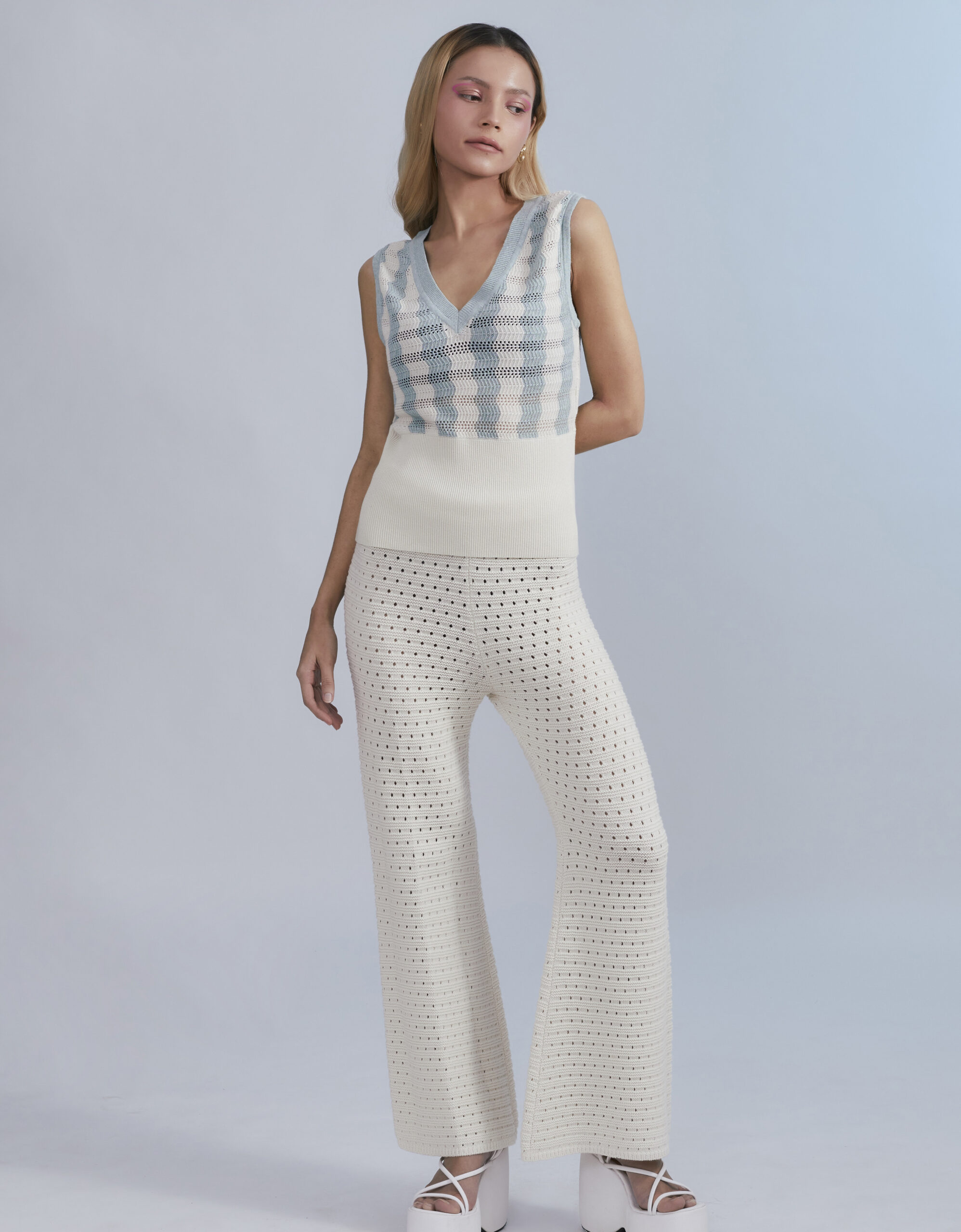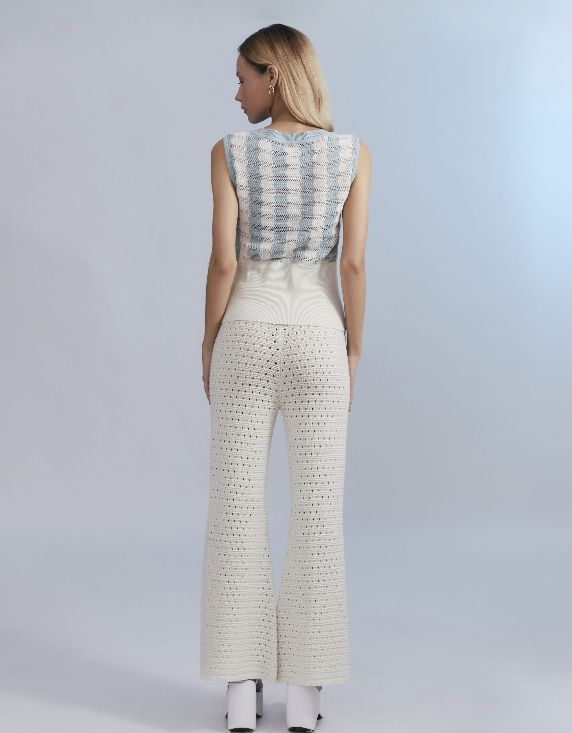 Detail : เสื้อแขนกุดถักนิต เอวจั๊มถัก Rib สวมใส่กระชับพอดีเข้าช่วงเอว ตัวเสื้อถักเป็นลายคลื่นแนวตั้งสลับ 2 สี ช่วยให้ดูเพรียว เป็นงานถักนิตผลิตจากเส้นใยรีไซเคิล