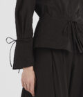 Detail : เสื้อเชิ้ตทรงเข้ารูป ตีเกล็ดเป็นรูปกากบาท ด้านหน้าเป็นใส่ซิปไนล่อนถอดได้ ขอบแขนแต่งด้วยดีเทลเทคนิครูดผ้าย่น มีเชือกผูกปลายแขน